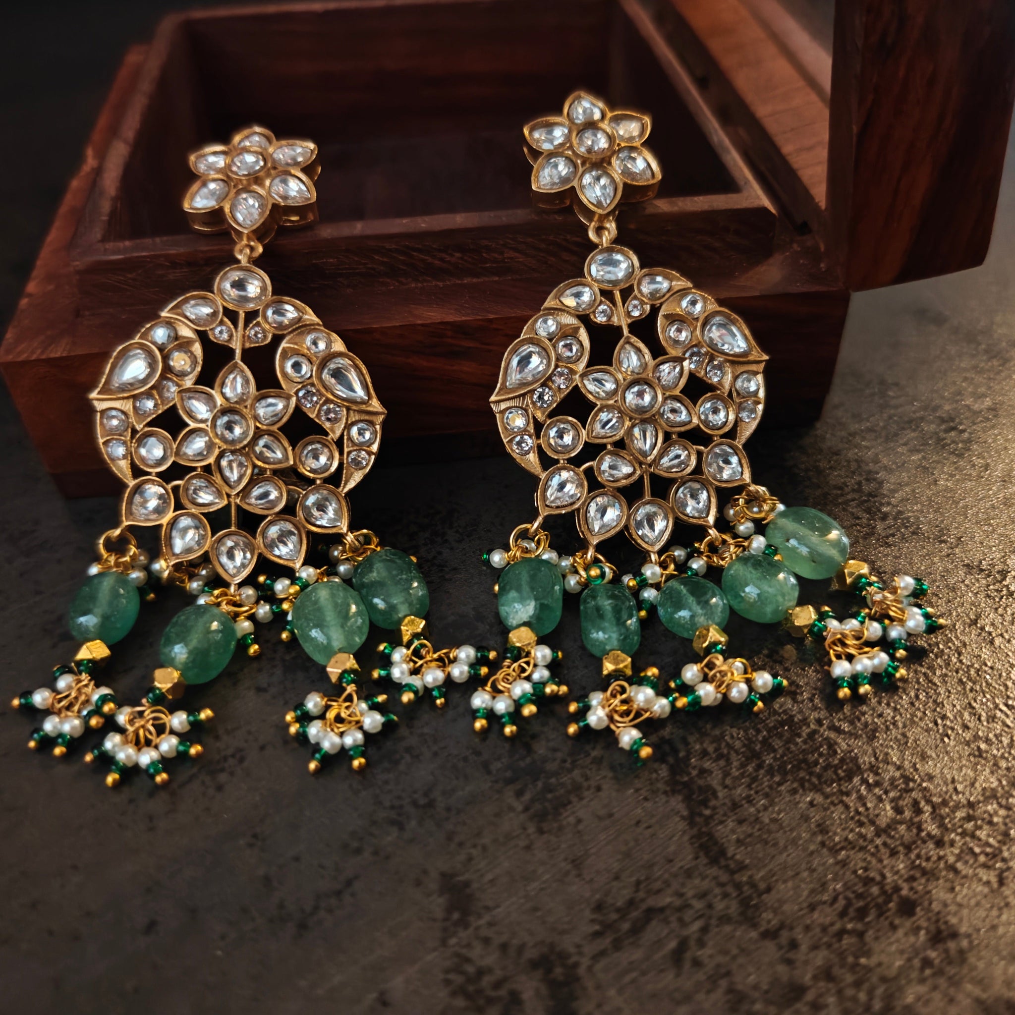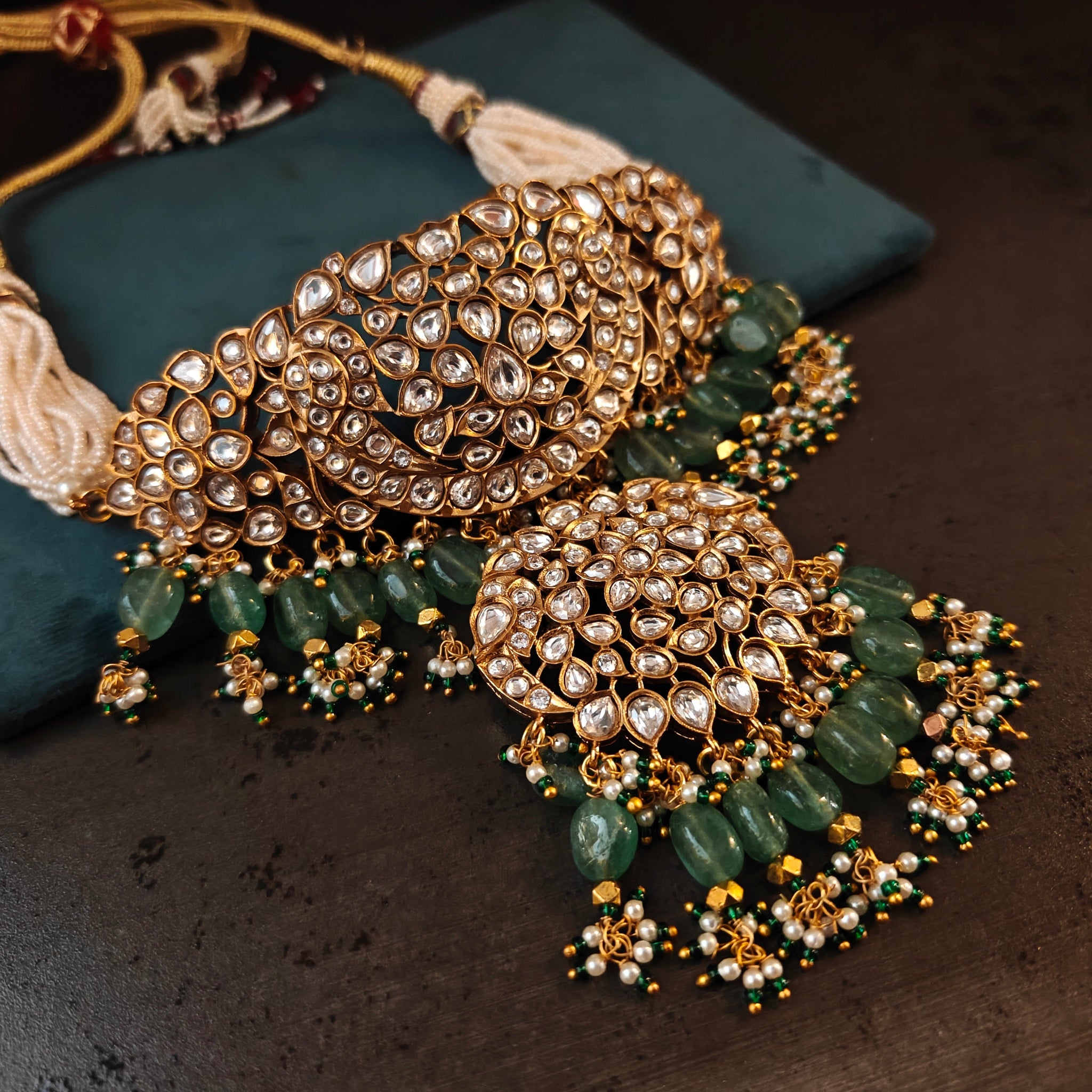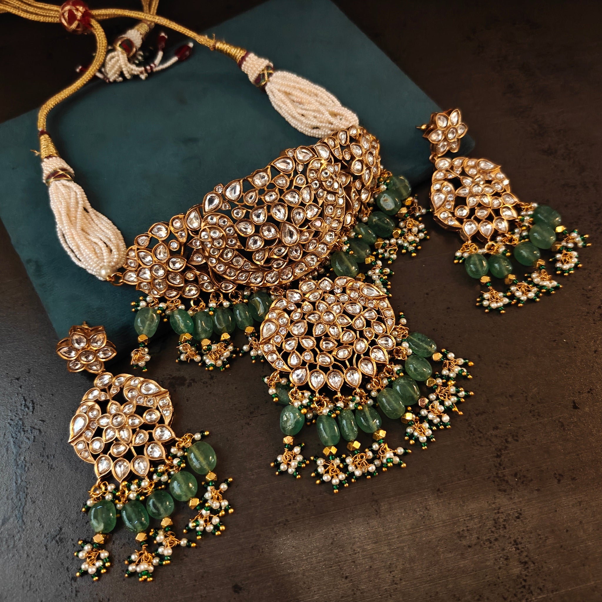 EXCUISITE DESIGNER POLKI KUNDAN CHOKER WITH EARRINGS AND FLUORITE STONE HANGINGS