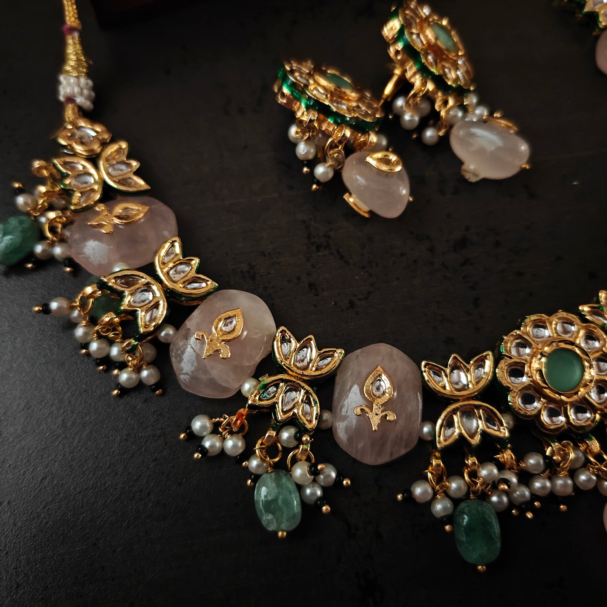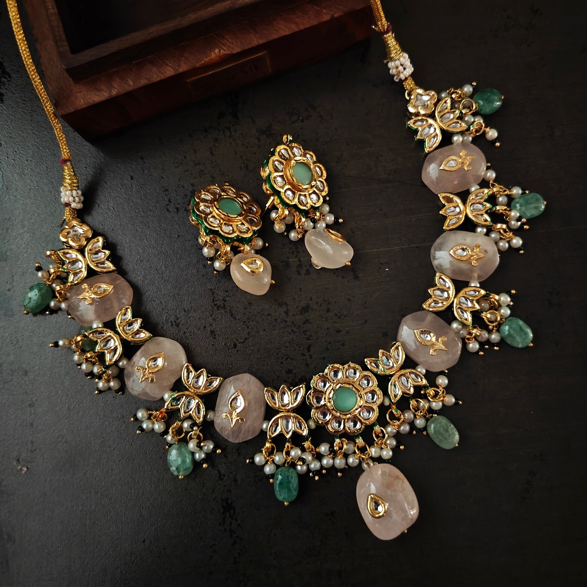 FINEST QUALITY BIKANERI KUNDAN NECKLACE WITH SEMI PRECIOUS STONE HANGINGS AND EARRINGS