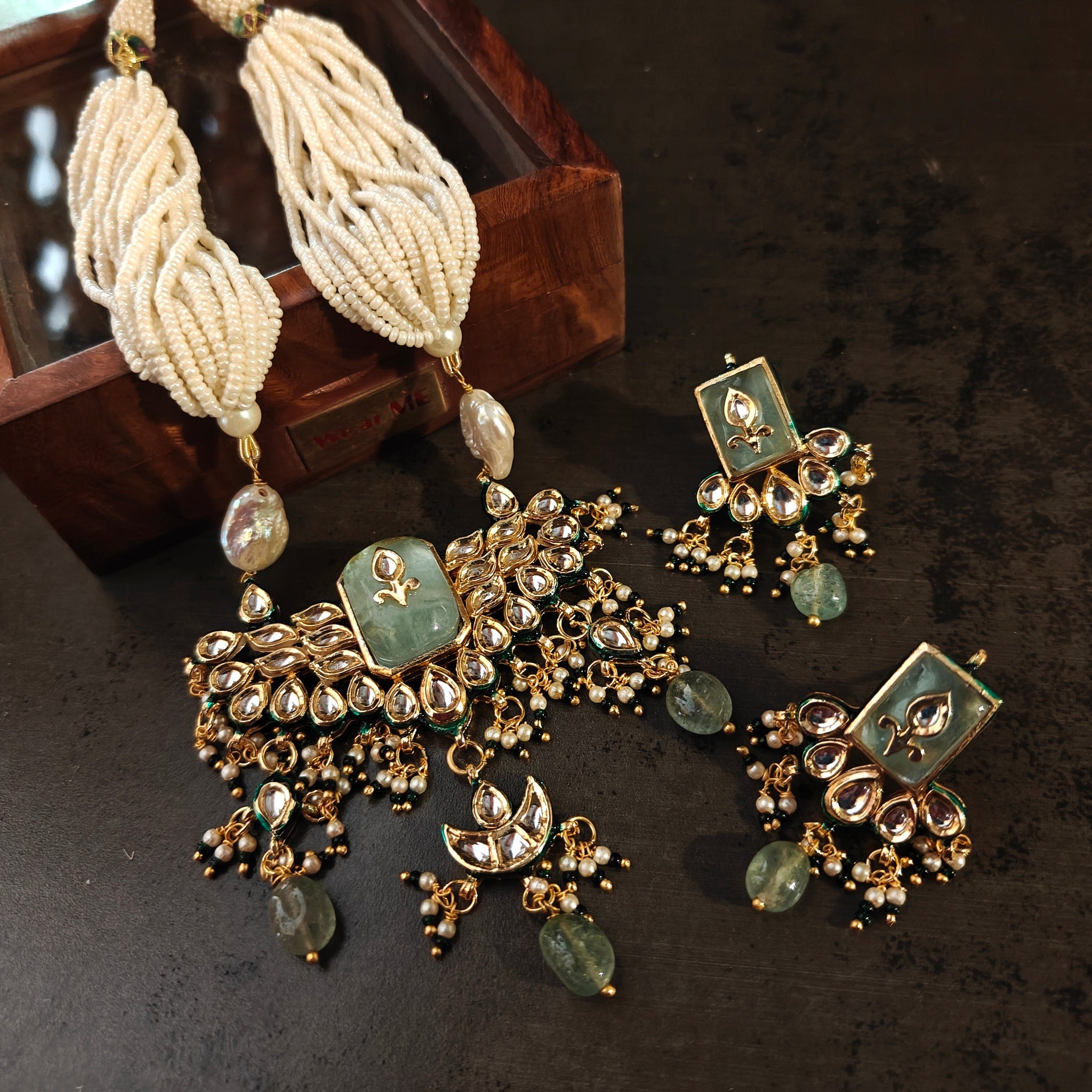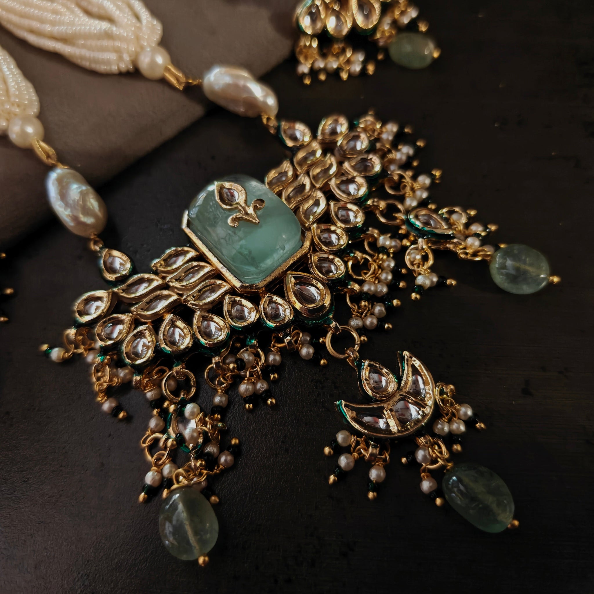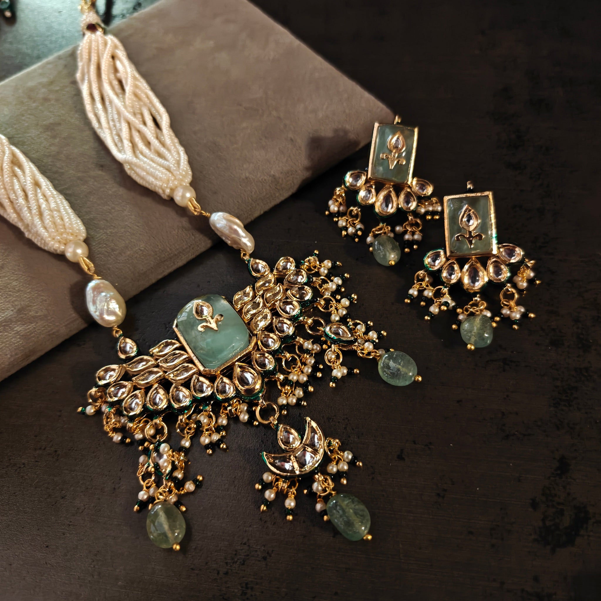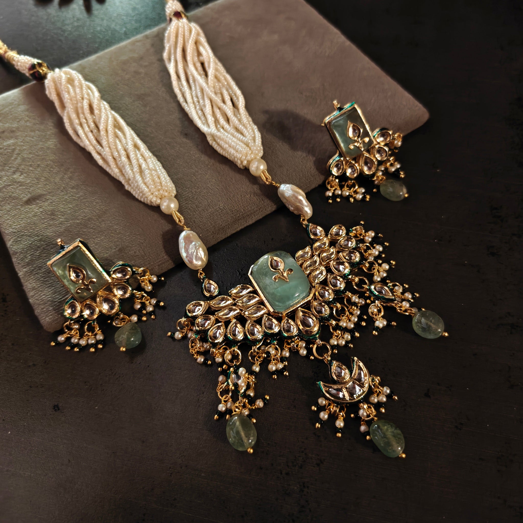 EXCLUSIVE BIKANERI KUNDAN NECKLACE WITH EARRINGS AND FLUORITE HANGINGS