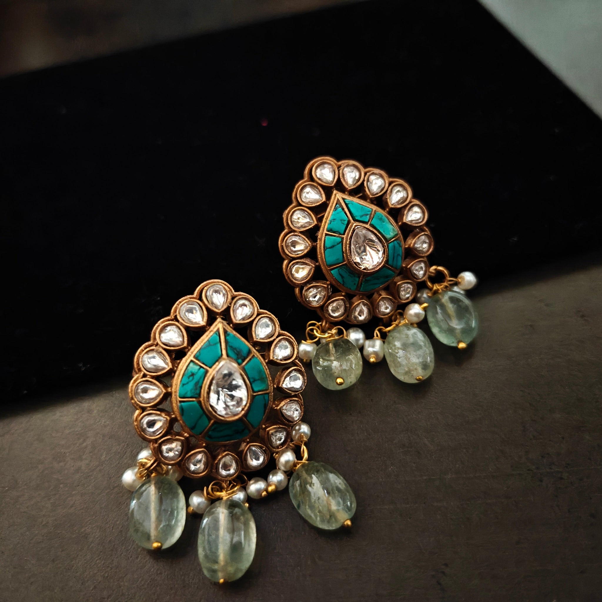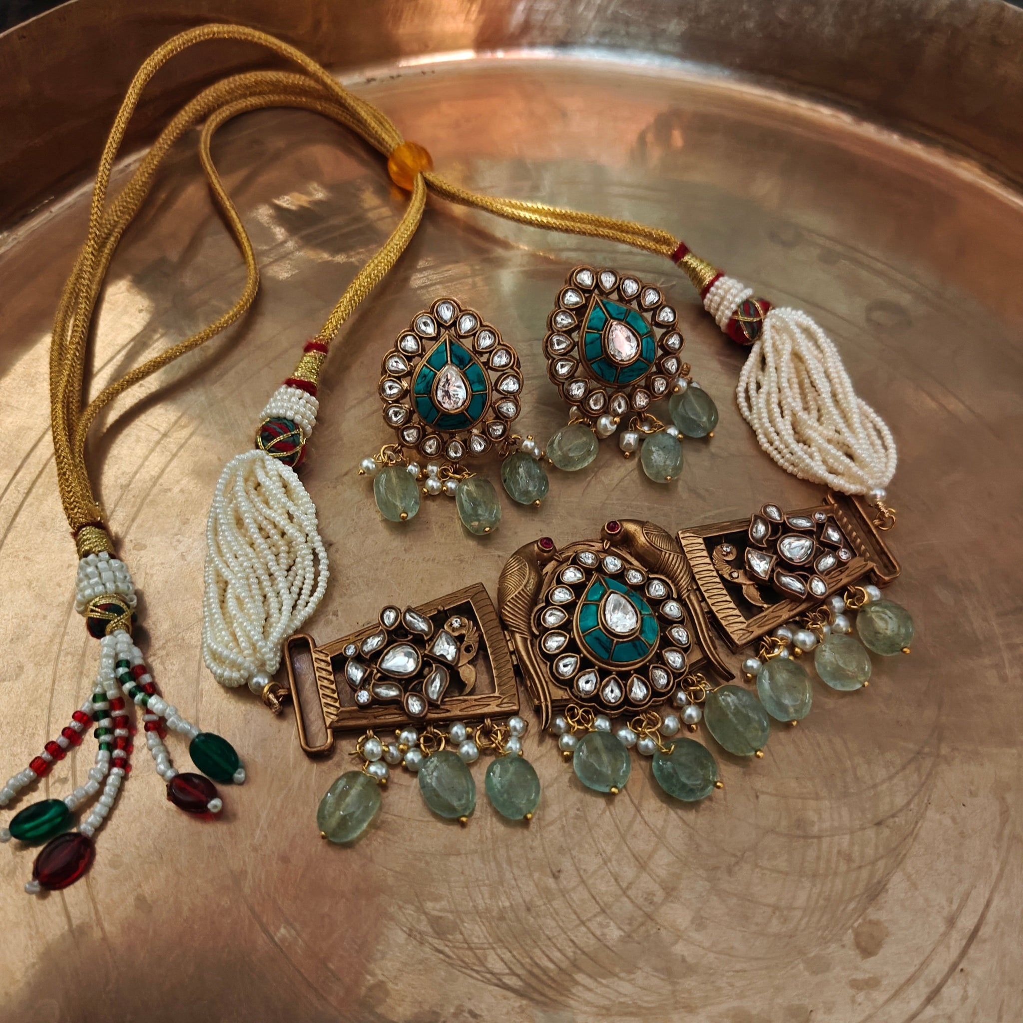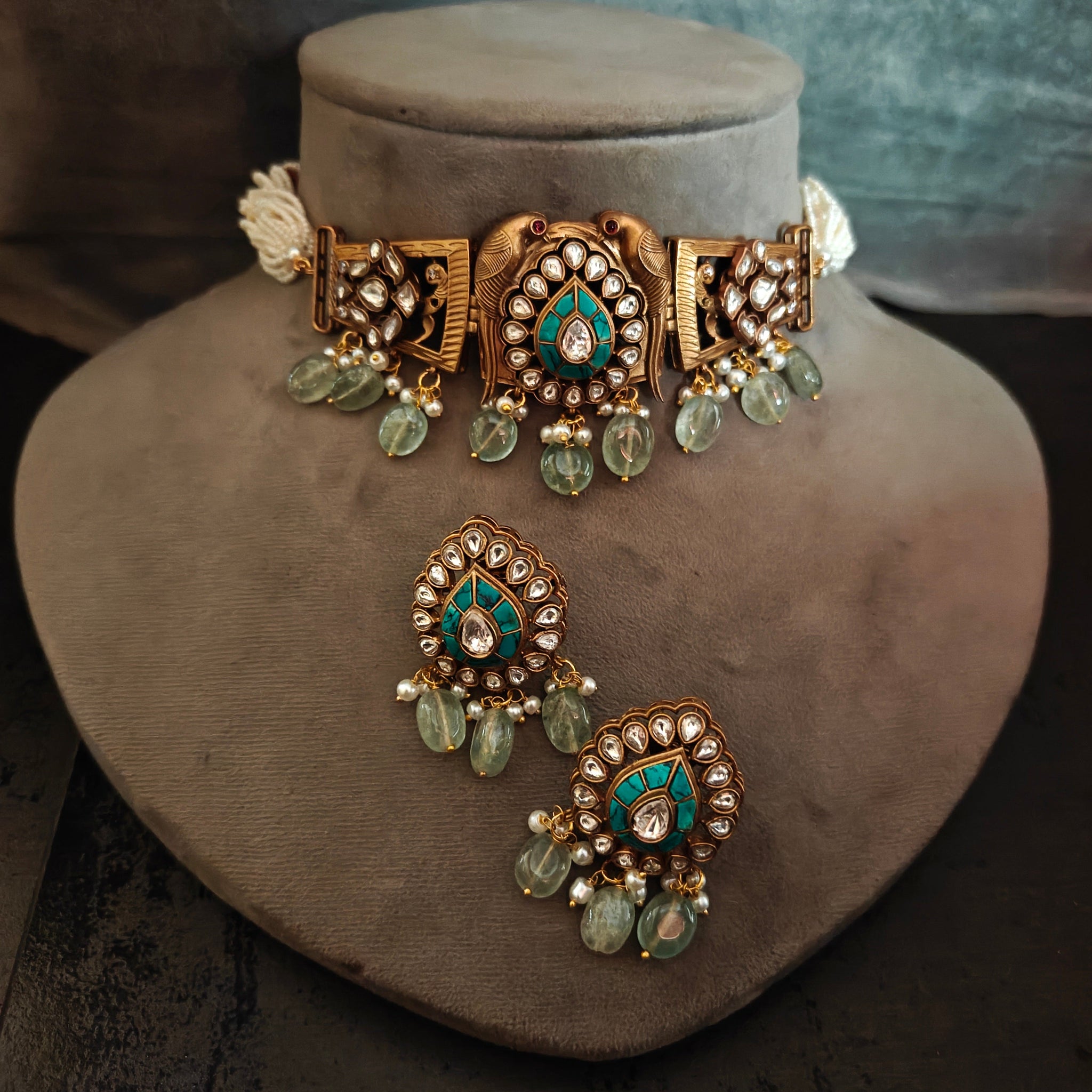 INDO WESTERN FIROZA NECKLACE WITH FLOURITE STONES AND POLKI